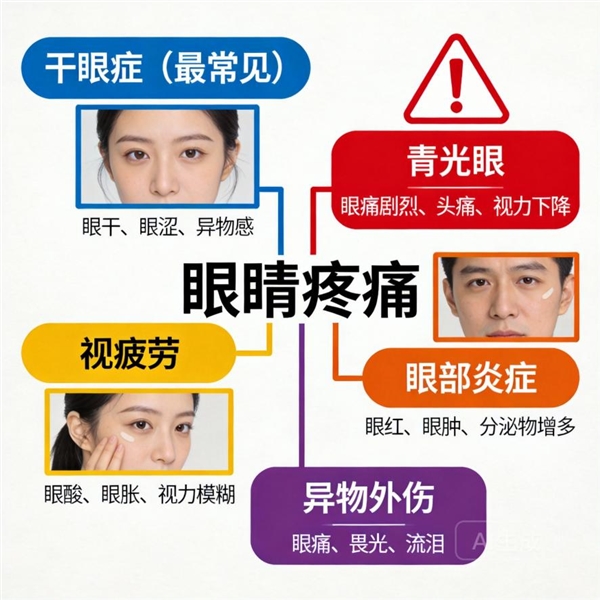 从上图可以看到,眼睛疼痛的原因主要分为几大类。了解这些基本分类,是进行自我初步判断的第一步。